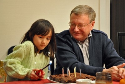 Ông Tom Knobel cùng con gái thắp nến mừng sinh nhật 6 tuổi.