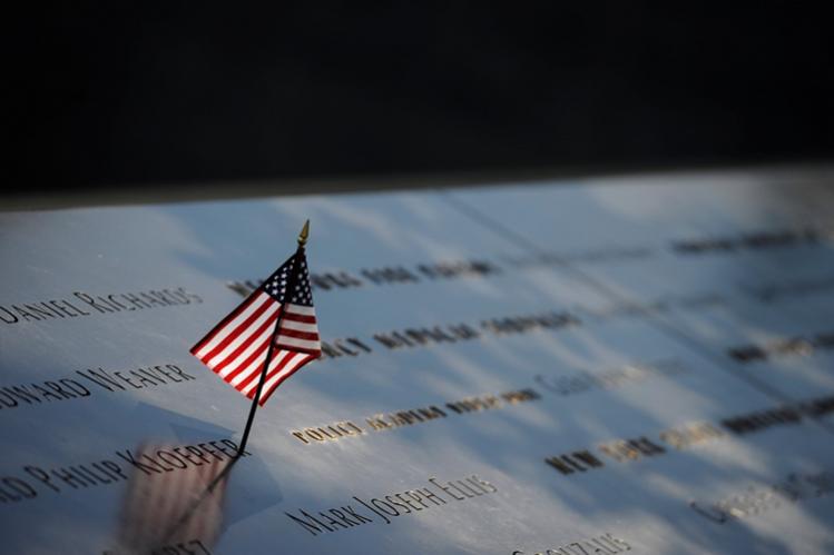 Lá cờ Mỹ được cắm trên tên của một nạn nhân khắc trên bia tưởng niệm những người thiệt mạng trong vụ khủng bố tại Manhattan.