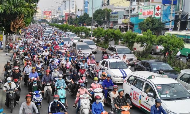 Xe cộ ken đặc trên đường, di chuyển rất chậm