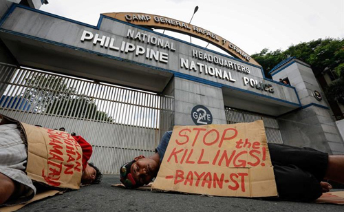 Người Philippines biểu tình trước trụ sở cảnh sát quốc gia phản đối các vụ giết người không qua xét xử. Ảnh: Inquirer