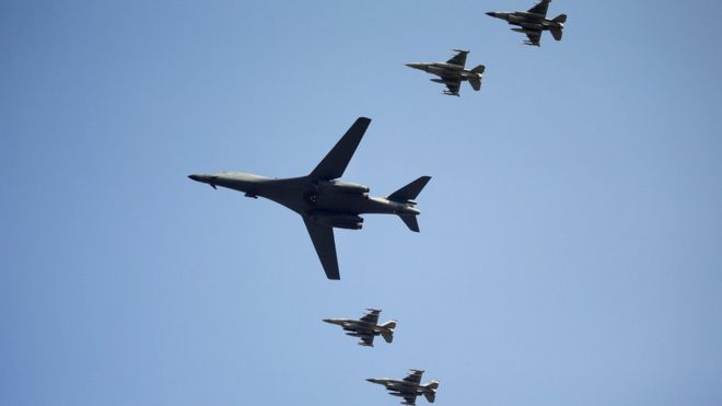 Mỹ phô diễn hai máy bay ném bom chiến lược siêu thanh B-1 Lancer trên vùng trời Nam Hàn trong động thái biểu dương lực lượng, chỉ vài ngày sau khi Bắc Hàn tiến hành vụ thử hạt nhân thứ 5. Hai máy bay ném bom thực hiện chuyến bay ở độ cao thấp trên một căn cứ không quân nằm cách biên giới 77km.