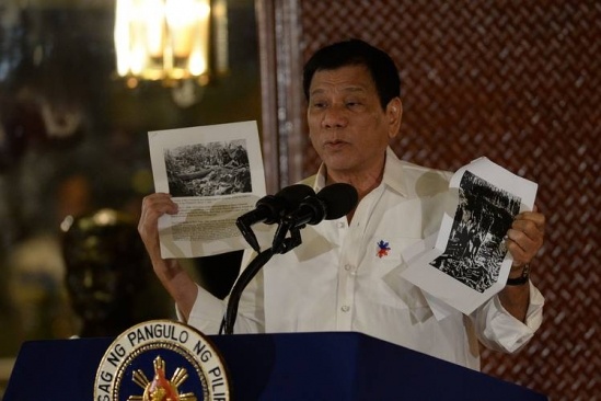 Ông Duterte giơ hai bức ảnh làm bằng chứng cho thấy lính Mỹ "khơi mào" các cuộc nổi dậy của người Hồi giáo ở miền Nam Philippines. Ảnh: WSJ