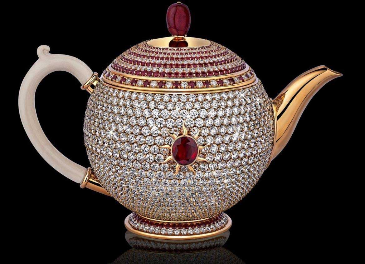 Để trang trí ấm cần đến hơn 1.600 viên kim cương và 388 viên hồng ngọc. Ở giữa ấm là viên ruby hơn 6 carat (1,2 gram), còn trên nắp ấm là chiếc vương miện với viên ngọc khủng 20 carat (khoảng 4 gram).