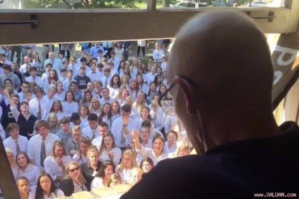 Trong đoạn clip ghi lại khoảnh khắc xúc động đó, người ta thấy người thầy giáo đang cố gắng ngăn dòng nước mắt trong khi lắng nghe 400 học sinh cất tiếng hát thể hiện lòng kính yêu đối với người thầy đang chiến đấu chống lại căn bệnh ung thư..