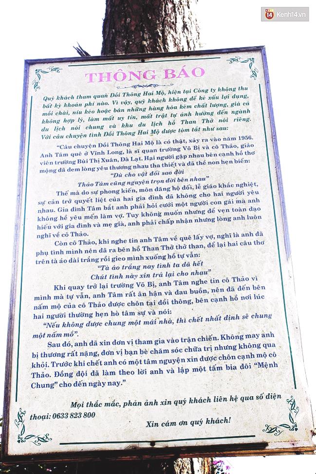 Khu vực này có một bảng thông báo, tóm tắt câu chuyện tình Đồi thông hai mộ, nội dung tóm tắt giống như những ghi chép trong cuốn sách “Đà Lạt, danh thắng và huyền thoại” của tác giả Trần Huy Hùng Cường. Theo đó, chuyện xảy ra vào năm 1956, cậu sinh viên Vũ Minh Tâm (Vĩnh Long) học tại trường Võ Bị Quốc Gia Đà Lạt (nay là Học viện Lục quân Đà Lạt). Anh đem lòng thương một thiếu nữ người địa phương, tên là Lê Thị Thảo, giáo viên dạy Văn trường Bùi Thị Xuân.