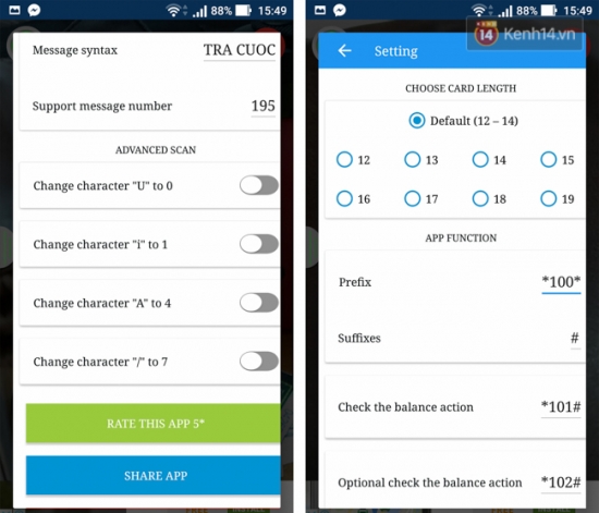 Giao diện của Card Scan cũng rất đơn giản, trong đó màn hình chính là để quét mã thẻ, biểu tượng góc trái là bật đèn flash để soi mã chính xác hơn trong điều kiện thiếu sáng, còn góc phải là phần Cài đặt, đây là nơi để bạn tùy chọn độ chính xác khi quét bằng cách giới hạn số lượng ký tự hoặc thay đổi cú pháp để phù hợp với từng nhà mạng.
