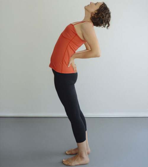 Tư thế này có tác dụng tăng cường sức mạnh cho cột sống và giúp giảm căng thẳng. Đứng thẳng, 2 chân mở rộng bằng vai, 2 bàn tay đặt vào eo lưng, từ từ ngả lưng về phía sau, ưỡn ngực ra trước và giữ nguyên tư thế trong 8 nhịp thở đồng thời hít thở sâu.