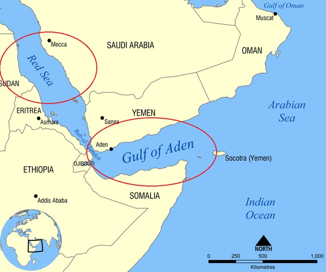 Biển Đỏ và Vịnh Aden trên bản đồ (khoanh tròn đỏ).