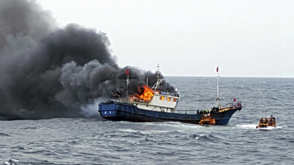 Tàu cá Trung Quốc cháy sau khi cảnh sát biển Hàn Quốc xông lên kiểm tra chiều 29.9.2016 trên vùng biển gần đảo Hong (Hàn Quốc)