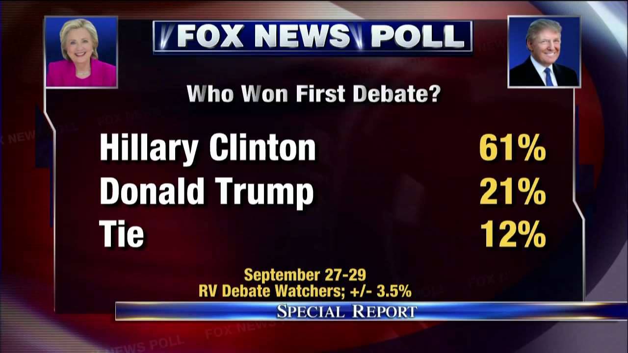 Nếu cuộc đua vào Nhà Trắng chỉ là sự đối đầu giữa bà Hillary và ông Trump, kết quả thăm dò cho thấy khoảng cách hai bên là 5 điểm % với bà Hillary dẫn trước ở mốc 49%. Còn về nhận định ai là người chiến thắng sau màn "so găng" đầu tiên, bà Hillary cho ông Trump "hít khói" với tỉ lệ % cách biệt lần lượt là 61:21.