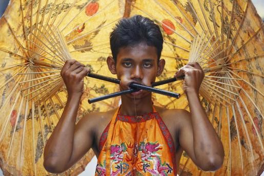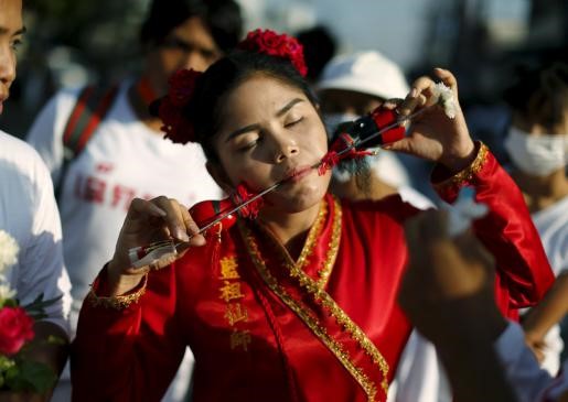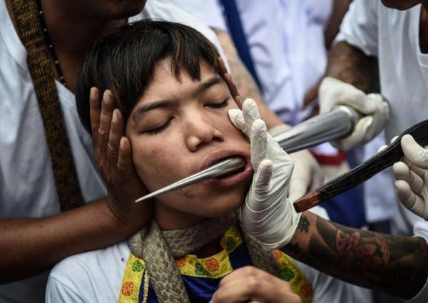 Lễ hội ăn cháy nổi tiếng ở Phuket, Thái Lan năm nay được tổ chức vào ngày 1/10. Lễ hội này thu hút hàng ngàn du khách tới xem. Tại đây các tín đồ khỏe mạnh sẽ nhịn ăn và biểu diễn những hoạt động hết sức độc đáo và vô cùng rùng rợn. Họ sử dụng mọi vật dụng sắc nhọn để xuyên qua miệng, mặt, cơ thể.