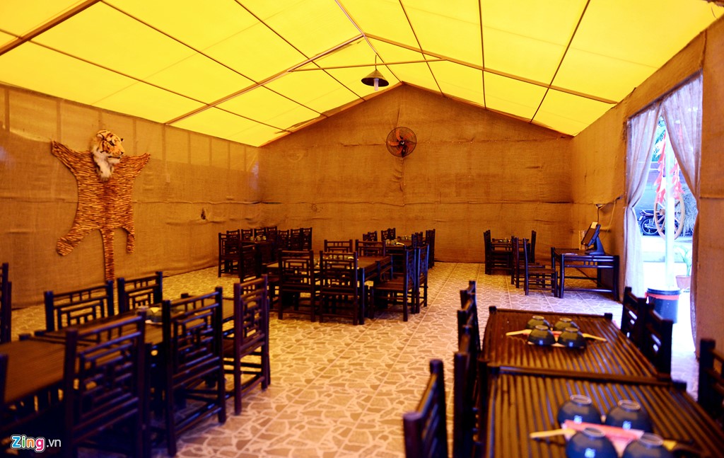 Nhà hàng có diện tích 1.700 m2 ở quận Bình Thạnh (TP.HCM), được thiết kế giống như doanh trại thời xưa. Ngay cổng ra vào có những chiếc cọc chống tạo thành hàng rào doanh trại có chòi canh.