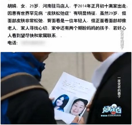 Sau khi sinh đứa con đầu lòng, người phụ nữ xinh đẹp ở Hà Nam, Trung Quốc bỗng nhiên trở thành bà lão 80 tuổi vì căn bệnh nhão da quái ác. Ôm theo bao mặc cảm, cô đã quyết định bỏ nhà ra đi, khiến cho người chồng chung thủy phải lặn lội khắp các hang cùng ngõ hẻm để tìm vợ. Hồ Quyên, sinh năm 1985, người Hà Nam, Trung Quốc, đã kết hôn và là mẹ của 2 đứa con xinh xắn, đáng yêu. Tuy mới ngoài 30 tuổi, nhưng bà mẹ 2 con này lại sở hữu một gương mặt già nua như bà lão 70-80 tuổi.