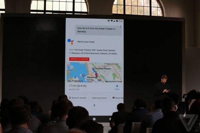 Tại sự kiện, Google đã trình diễn khả năng Assistant có thể lọc ảnh dựa trên thời gian hoặc địa điểm mà bạn yêu cầu, chơi bản nhạc mà bạn đọc tên cũng như chọn ứng dụng nhạc mặc định mà bạn yêu thích. Assistant được Google tích hợp thẳng vào Now on Tap, tức bạn có thể vuốt để xem thêm nhiều thông tin về kết quả, ví dụ một kết quả về nhà hàng có thể có thêm các thông tin về đánh giá và địa chỉ.