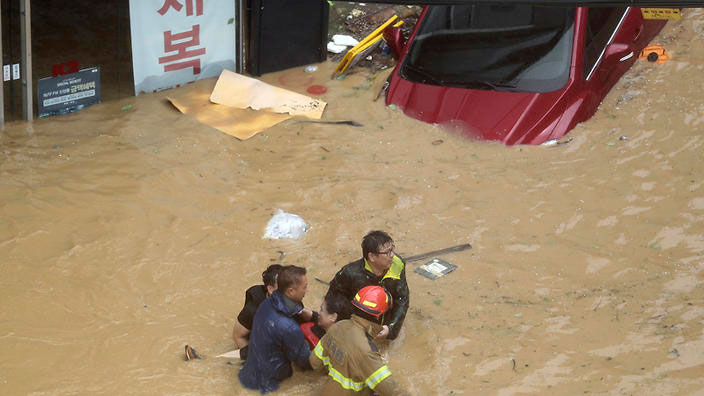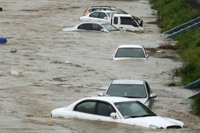 Các phương tiện và đồ đạc trôi nổi giữa dòng nước ngập cao tại miền nam Hàn Quốc. Ảnh: Yonhap