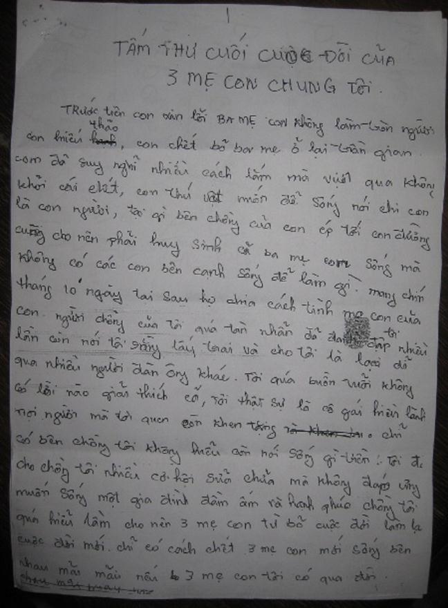 Tôi đã cho chồng tôi nhiều cơ hội sửa chữa mà không được. Muốn sống một cuộc sống đầm ấm, hạnh phúc nhưng chồng tôi quá hiểu lầm. Chỉ có cách chết 3 mẹ con tôi mới bên nhau mãi mãi. Mẹ con tôi chết xin mọi người mang về Việt Nam chôn chung, đừng chia cách 3 mẹ con tôi”.