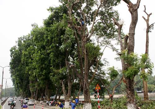 Từ ngày 11/10, hàng cây cổ thụ trên từ ngã tư Kim Mã- Liễu Giai đến đền Voi Phục được tỉa cành, để bứng gốc di chuyển đi
