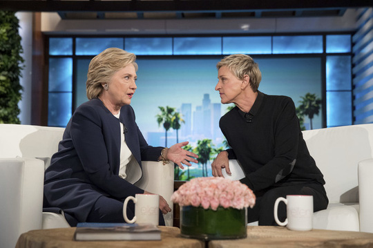 Bà Clinton tâm sự với MC Ellen về việc ông Trump cứ lẩn quẩn sau lưng bà trong buổi tranh luận trực tiếp . Ảnh: Daily Mail