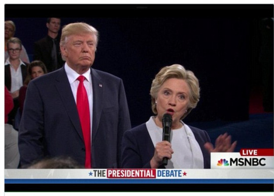 Ông Trump liên tục vòng ra sau lưng bà Clinton trong buổi tranh luận. Ảnh: Twitter