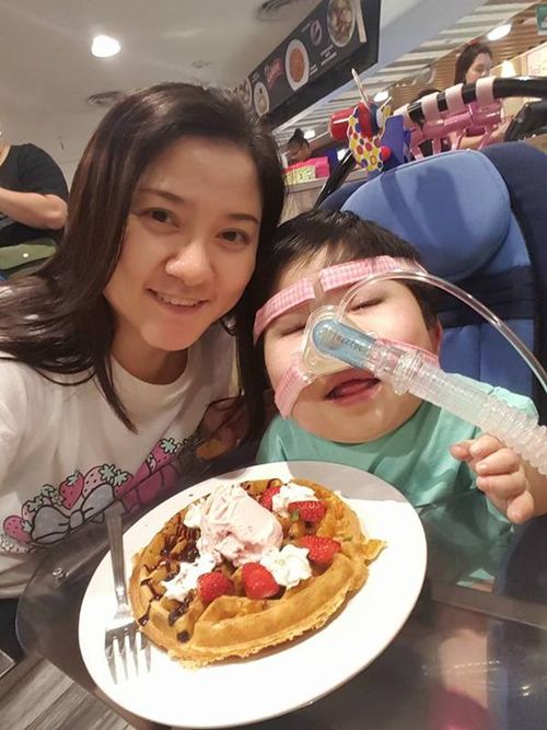 Lên 3 tuổi Pei bị ngưng thở khi ngủ và nên buộc phải đeo mặt nạ dưỡng khí.
