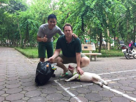 Theo anh Giáp, cứ chiều hàng ngày hoặc buổi sáng cuối tuần, Ben cùng chú chó lại phóng xe máy vào công viên Linh Đàm để nhặt rác. Người đàn ông nước ngoài dùng cốp xe của mình làm... thùng rác.