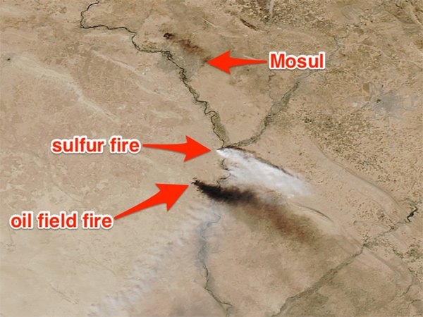 Trong tuần, NASA đã công bố 2 bức ảnh. Bức đầu tiên do vệ tinh Aqua chụp ngày 22/10, cho thấy cột khói khổng lồ nhạt màu phun lên từ mỏ sulfur Al-Mishraq và cơ sở xử lý bị IS phóng hỏa.