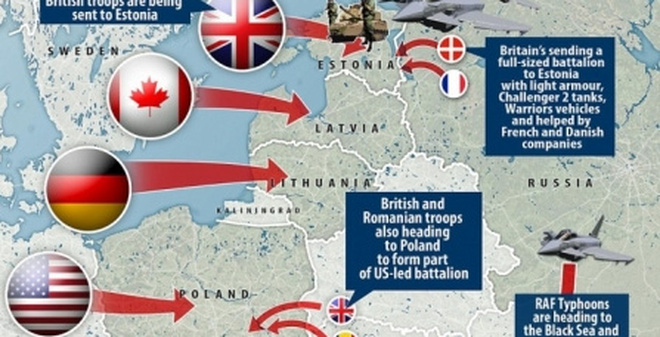 Cụ thể, Anh đã triển khai binh lính, xe tăng và chiến đấu cơ tới Estonia để ngăn chặn nguy cơ xâm lược từ phía Nga. Trong khi đó, lực lượng Anh và Romani cũng sẽ tham gia vào một tiểu đoàn của Mỹ tại Ba Lan.