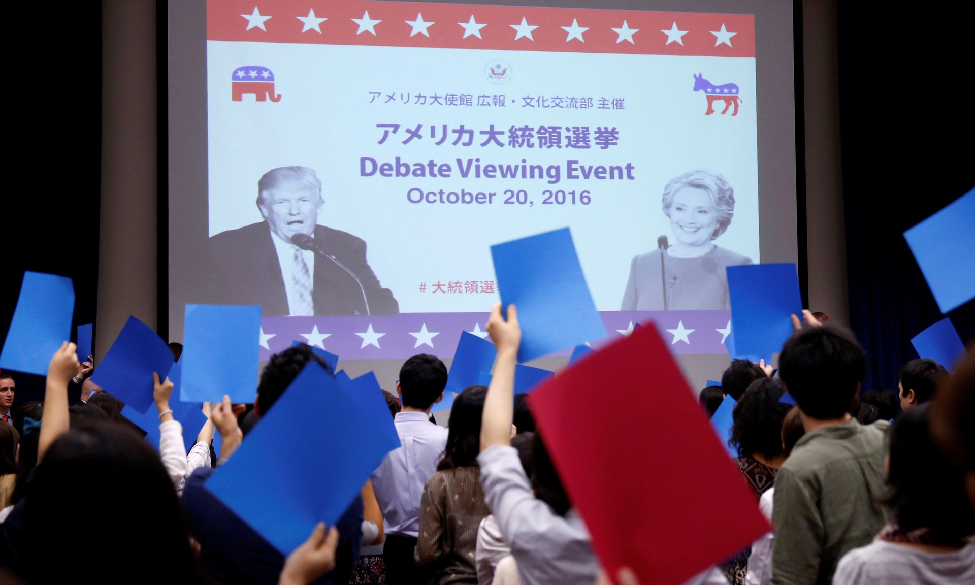 Các sinh viên tham gia một sự kiện theo dõi cuộc tranh luận tổng thống Mỹ ở Tokyo