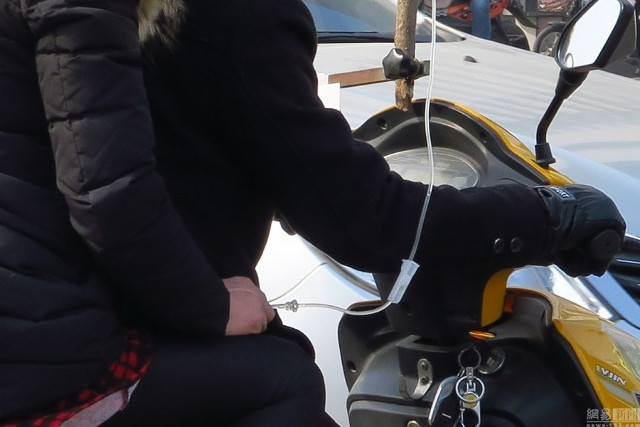 Hóa ra, người phụ nữ mặc áo phao đen ngồi đằng sau xe đang phải truyền dịch và chai dịch thì đang được treo lên một cành cây gắn vào đầu xe máy do nam thanh niên kia điều khiển.