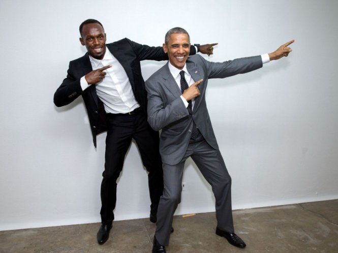 Tổng thống Obama (trước) biểu diễn động tác chiến thắng kiểu Usain Bolt cùng với VĐV nhanh nhất hành tinh khi ông có chuyến thăm Kingston, vào ngày 9-4-2015 - Ảnh: Pete Souza