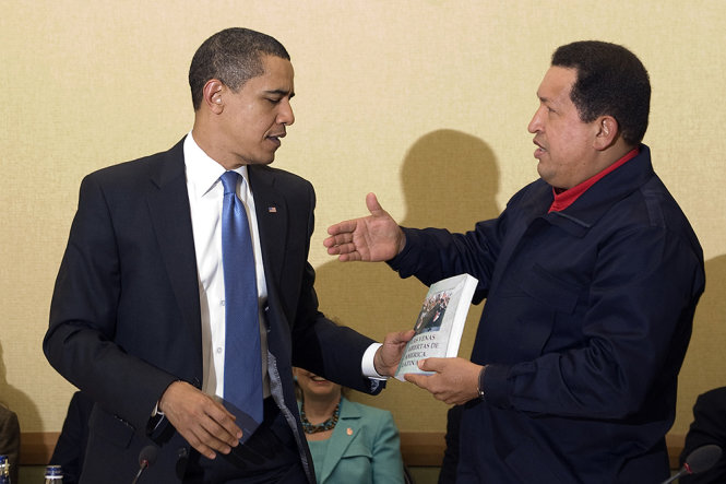 Nhận quà là cuốn sách "Những dòng huyết quản mở của châu Mỹ Latin" của nhà văn Uruguay Eduardo Galeano do chính tổng thống Hugo Chavez tặng vào tháng 4-2009 - Ảnh: AFP