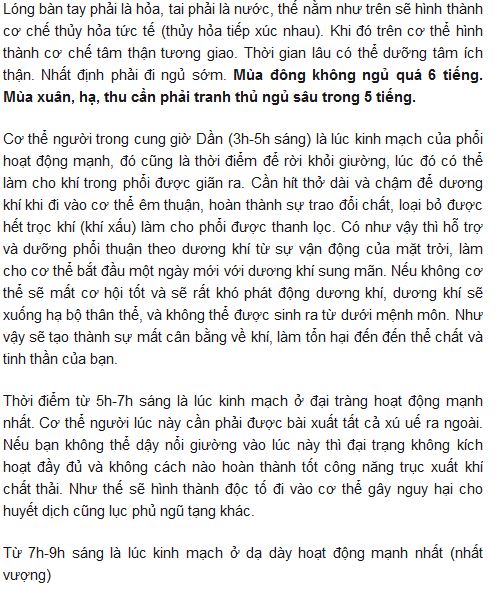 Giống như các quy tắc giao thông, người không hiểu về giấc ngủ rất dễ gặp các sự cố như trên. Bạn phải luôn nhớ rằng: Ngủ cũng có quy tắc. Từ 23h đến 3h sáng (giờ Tý và giờ Sửu) là lúc lá gan hoạt động mạnh nhất. Mật từ gan sẽ được tiết vào máu: “Nằm xuống thì máu chảy về gan, đứng dậy thì máu chảy đi”. Bạn nên bắt đầu đi nằm từ 22h, lặng lẽ không nói chuyện, giấc ngủ tự nhiên sẽ đến khoảng 23h. Mật từ gan tiết vào máu, lọc bỏ chất độc, chất thải, làm cho huyết dịch trở nên tươi mới, trong sạch. Như thế đến 100 tuổi cũng không có bệnh viêm gan hay sỏi mật. Người phải thức đêm quá nhiều, mật từ gan sẽ không được đưa đủ vào máu, huyết dịch tự nhiên không được thải độc, không được làm sạch, mật trong gan cũng không cách gì dược tiết ra đều đặn. Dễ gây ra sỏi mật, u nang, viêm gan B đại tam dương (có 3 phản ứng dương tính trong 5 xét nghiệm viêm gan B) và viêm gan B tiểu tam dương (biến thể của đại tam dương).