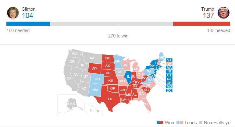 Nhiều người vô cùng ngỡ ngàng với tiến trình bầu cử tại Mỹ. Hiện Donald Trump đang dẫn trước Hillary Clinton 137:104. Đặc biệt ở bang chiến địa Florida, Trump đang dẫn trước khi 92% số phiếu đã được kiểm. Cuộc đua vào chiếc ghế Tổng thống Mỹ giữa 2 ứng cử viên Donald Trump của Đảng Cộng hòa và Hillary Clinton của Đảng Dân Chủ đã bắt đầu bước vào giai đoạn gay cấn.