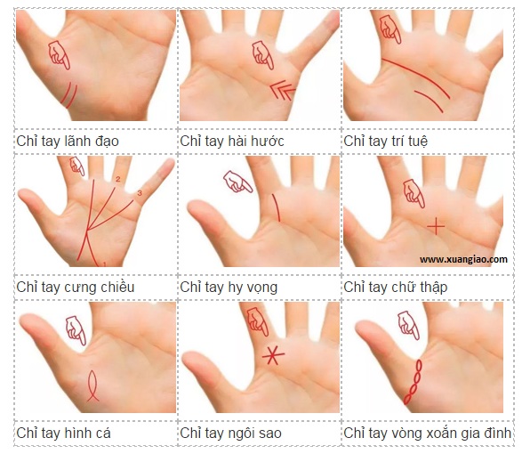 Con người sinh ra đã có số mạng. Điều đó thể hiện ở chỉ tay đó. Bạn hãy xòe tay ra nào và so sánh với những chỉ tay trong hình dưới đây. Nếu trên bàn tay bạn xuất hiện chỉ tay hình chữ thập, chỉ tay hình ngôi sao hay chỉ tay hình cá, vậy xin chúc mừng bạn – Cuộc đời bạn sẽ gặp nhiều may mắn, hạnh phúc.