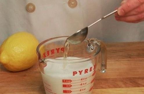 + Cho sữa vào nồi nhỏ và đun nóng, lúc sữa vừa mới ấm ấm thì bỏ hết phần nước cốt chanh vào.