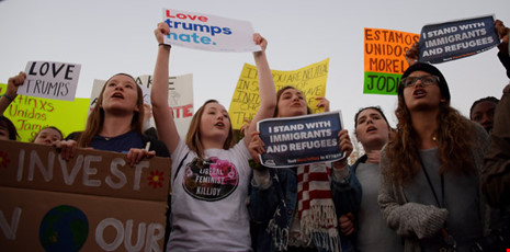 Sáng 10-11 tại San Francisco có hơn 1.000 học sinh trung học bỏ lớp, mang cờ Mexico, cờ cầu vồng biểu tượng của cộng đồng đồng tính tuần hành quanh TP phản đối Trump.
