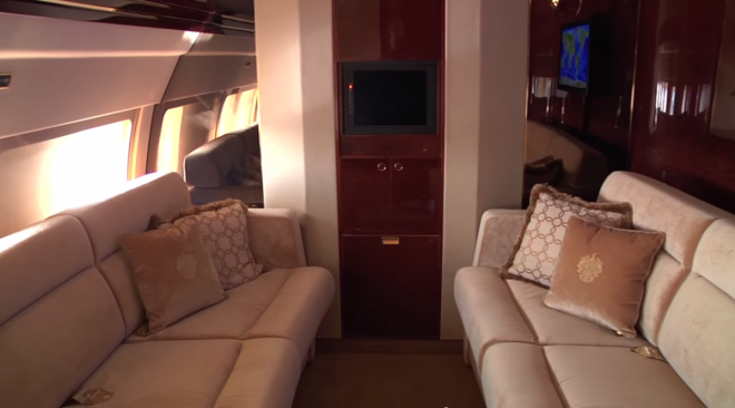 Phòng tiếp khách riêng trên chuyên cơ, cũng được trang bị tivi gắn trên tường.