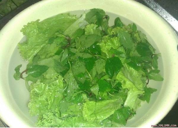 Chuẩn bị nửa chén giấm trắng, một thìa baking soda, và 20 giọt tinh dầu hạt bưởi hoặc nước cốt chanh, pha cùng nước lạnh, sạch để rửa rau của bạn.