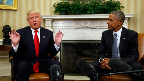 Ông Donald Trump (trái) trong chuyến làm việc đầu tiên trong Phòng Bầu Dục của Nhà Trắng hôm 10.11 vừa qua Reuters