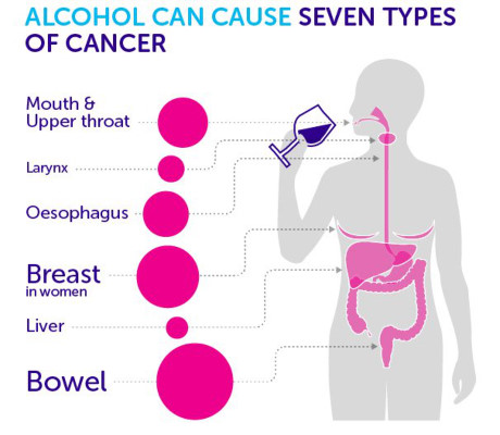 Rượu làm tăng nguy cơ mắc 7 loại ung thư: ung thư vú, gan, miệng và họng. thanh quản, thực quản, ruột.