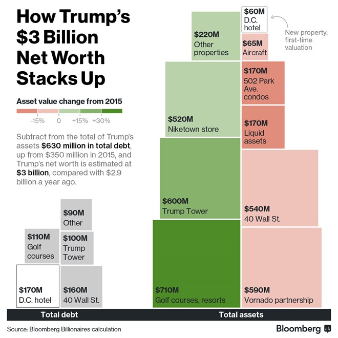 Tóm lại, theo bảng xếp hạng tỷ phú Bloomberg Billionaires Index, tổng tài sản của Donald Trump tăng nhẹ từ mức 2,9 tỷ USD của một năm trước lên 3 tỷ USD. Còn theo ước tính của tạp chí Fortune và Forbes, ông Trump có gần 5 tỷ USD. Những con số trên nhỏ hơn rất nhiều so với con số 10 tỷ USD mà ông Trump đã tuyên bố.