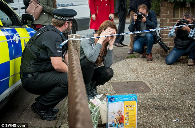 Một người phụ nữ đặt hoa và đồ chơi bên ngoài căn nhà, cầu nguyện cho cậu bé Archie xấu số.