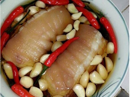 – Thịt rửa và cạo sạch lông ở bì, ngâm qua dấm và rượu rồi vớt ra để ráo.