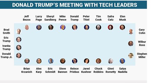Hôm qua 14/12, Tổng thống đắc cử Donald Trump đã có cuộc gặp các lãnh đạo từ Amazon, Tesla, Apple, Facebook, Alphabet và nhiều hãng công nghệ lớn khác tại New York. Cuộc gặp gỡ này vô cùng quan trọng để tăng cường hợp tác thúc đẩy nền kinh tế Mỹ. Tại cuộc họp này ông Trump nói: "Chẳng người nào trên thế giới giống những người đang ngồi trong căn phòng này đâu. Bất kỳ việc gì chúng tôi có thể giúp, chúng tôi sẽ làm cho các bạn. Các bạn có thể gọi người của tôi, hoặc gọi tôi. Không có gì khác nhau cả".