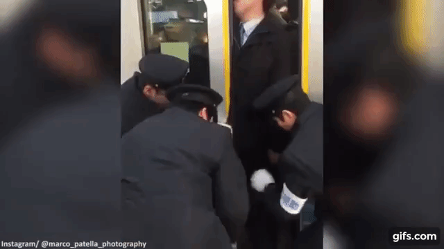 Từ đoạn hình ảnh có thể thấy hình ảnh một nhân viên văn phòng tay cầm điện thoại, mặt bình thản đứng cạnh cửa tàu và chờ đợi để "được" chèn lên tàu dù rằng phía bên trong chẳng còn thấy chỗ trống. Sau đó, các nhân viên ga tàu, thường là các sinh viên làm thêm, sẽ "dồn hết sức bình sinh" để đẩy các hành khách cuối cùng vào sau cánh cửa.