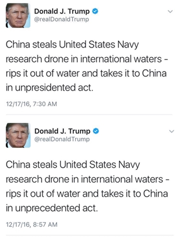 "Trung Quốc đánh cắp thiết bị nghiên cứu không người lái của hải quân Mỹ ở vùng biển quốc tế - lôi nó lên từ dưới nước và đưa nó tới Trung Quốc trong một hành động "không ra dáng tổng thống" (unpresidented), ông Trump viết trên Twitter hôm 17/12. Ông đã viết sai chính tả từ "chưa từng có tiền lệ" là "unprecedented" thành "unpresidented". Khoảng 90 phút sau, dòng tweet có lỗi bị xóa và thay thế bằng một phiên bản được sửa lại.