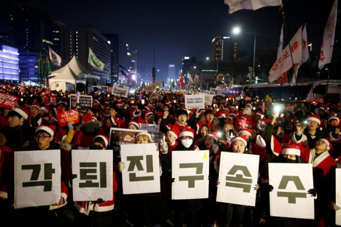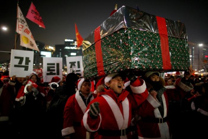 Vào đêm Giáng sinh có khoảng 200.000 ngàn người dân tập trung tại các con phố ở trung tâm thủ đô Seoul biểu tình.Cuộc biểu tình tiếp tục nổ ra yêu cầu Tổng thống Park Geun-hye từ chức.Người dân trong trang phục ông già Noel hô to khẩu hiệu......
