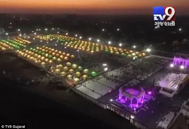 Hình ảnh ghi lại từ trực thăng cho thấy một góc trời sáng rực khi hàng trăm cô dâu cùng tổ chức đám cưới linh đình. Mỗi cô dâu còn được nhận 500.000 rupee (khoảng 167 triệu đồng) tiền quà, bao gồm vàng, bạc, ghế sofa và giường ngủ.