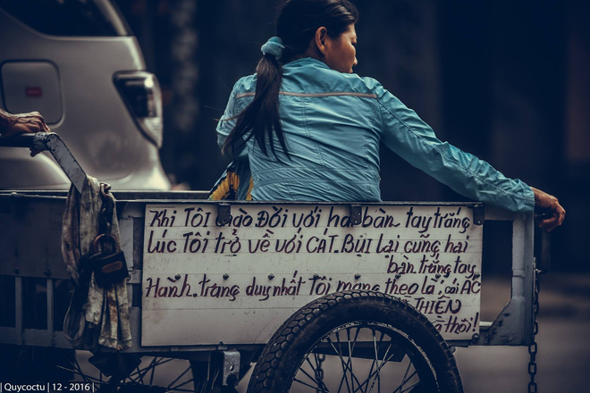 Không những vậy, dòng chữ "rất đời" được viết rõ trên chiếc xe ba gác của cụ cũng hút ánh nhìn của cộng đồng mạng. "Khi tôi chào đời với hai bàn tay trắng. Lúc tôi trở về với cát bụi lại cũng hai bàn tay trắng. Hành trang duy nhất tôi mang theo là cái Ác và Thiện mà thôi"