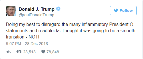 “Tôi đang cố gắng để bỏ qua những tuyên bố đầy kích động và cản đường của Tổng thống Obama. Tôi từng nghĩ rằng quá trình chuyển giao quyền lực diễn ra êm xuôi – Không phải vậy” – ông Trump khẳng định trên mạng Xã hội Twitter vào khoảng 9 giờ sáng 28-12 (giờ địa phương).